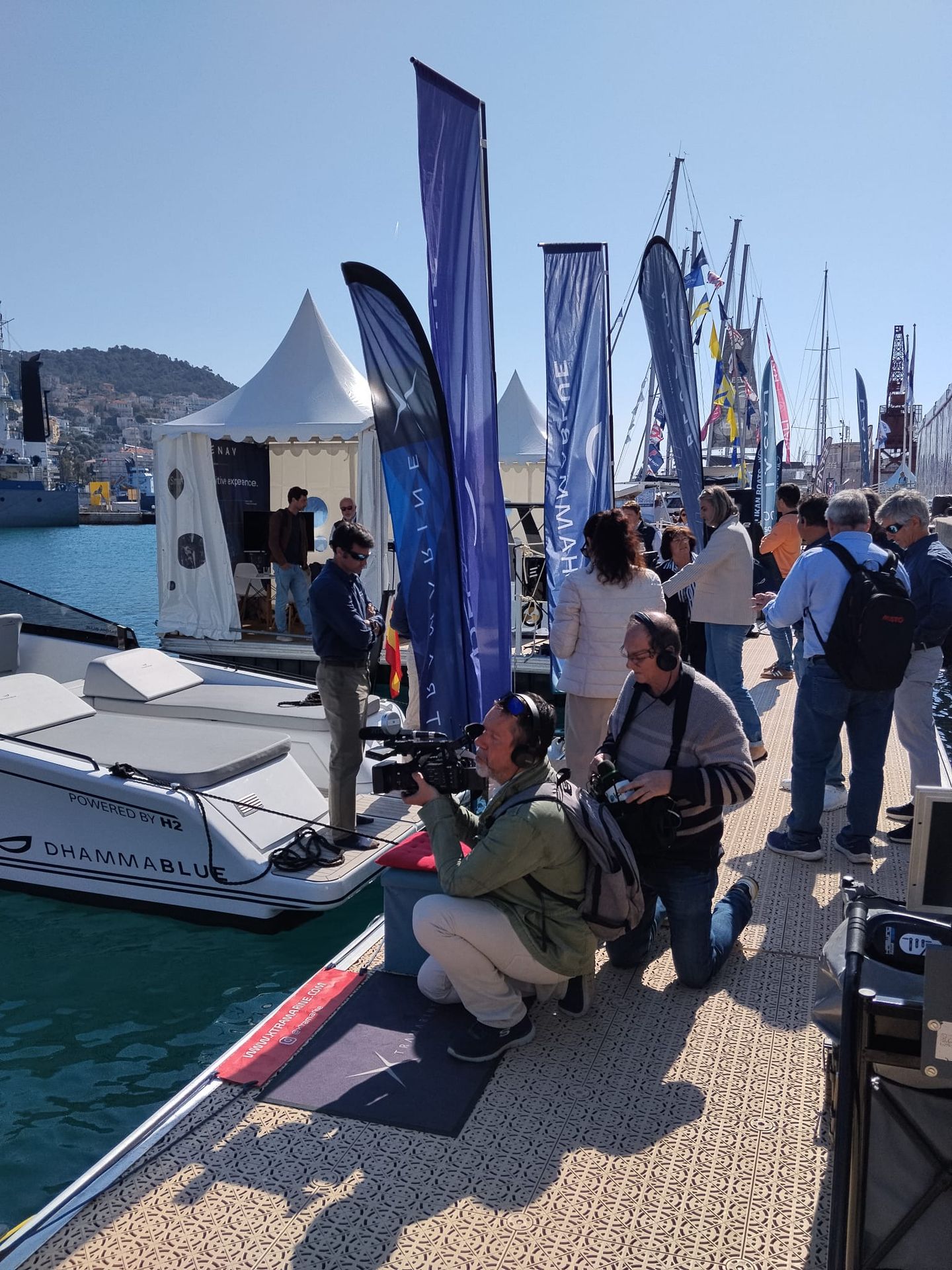 aurent Verdi, the reporter from France 3 TV, broadcasting from Nice Boating Tomorrow on board X-FUN 300.